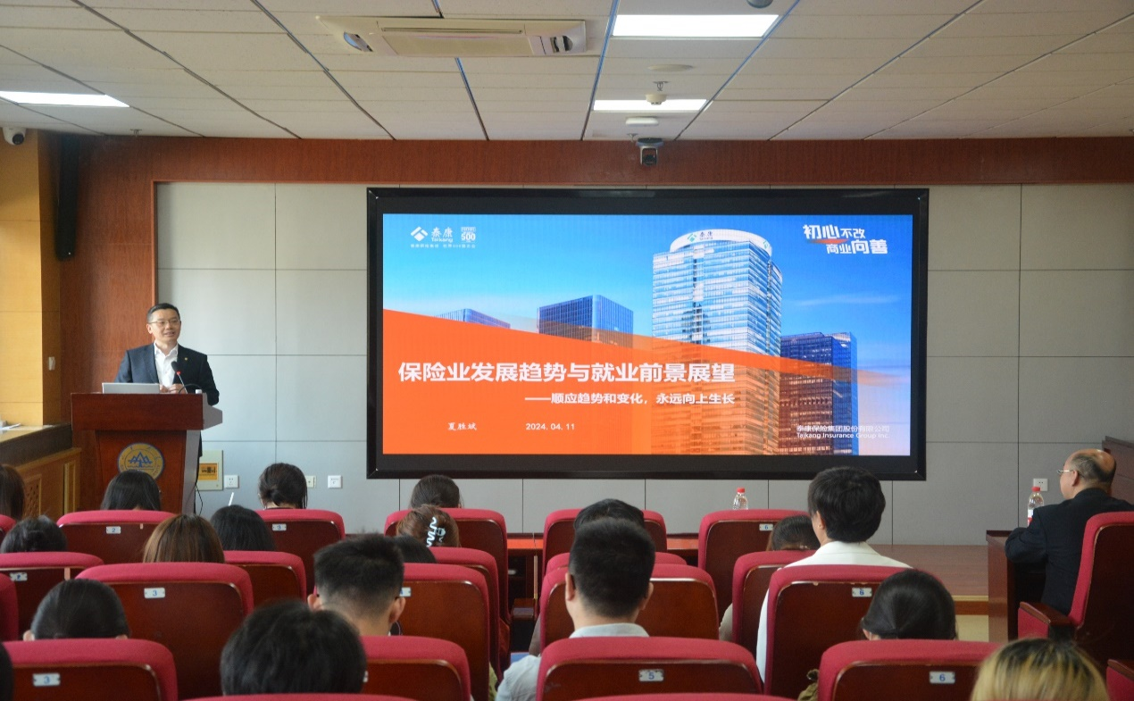 讲座内容围绕 “保险行业发展历程与前景展望”以及“个人如何在职业中成就自我”两方面展开。夏胜斌从传统寿险业的根基与兴起开始谈起,介绍了寿险业的发展脉络和不同时期的商业模式,结合保费增速、投资收益率、行业新单量、行业人力规模等大数据,分析了行业目前在宏观经济形势下面临的诸多挑战,以泰康保险从传统寿险中破局实现转型升级为例对保险行业未来发展进行了展望,特别强调了同学们在当前行业发展转型期应在认知层面和行动层面提前做好准备,以适应寿险行业全新商业模式。随后,夏胜斌结合个人经历和泰康保险发展历程向同学们提出了六条建议:一是要放大格局,经营思想, “先把心放到山顶,再寻找上山的路”;二是要顺应趋势、顺应变化,把握行业发展形势,避免“刻舟求剑”;三是要把握时机,在机会面前要勇于尝试,不要踌躇不前;四是要坚持精神至上,在事业发展面临阻碍时,要时刻记住:“三分靠专业,七分靠精神”;五是要谨记业精于勤,保持勤奋学习的态度和迎难而上的拼劲,增强本领,在职业发展中实现个人社会价值;六是要树立正确的价值观,坚守初心,做正确的事,立大志向。